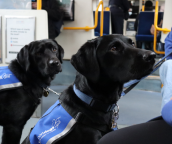 Support Dogs, Louis and Garry, in training at Cathedral tram stop.