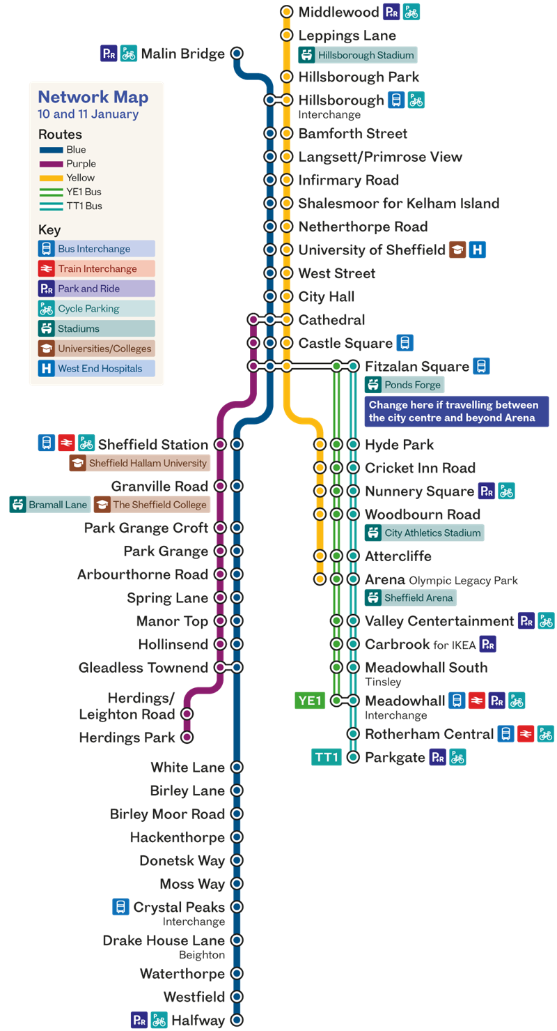 Replacement bus service TT1 and YE1 will operate between Sheffield city centre and Meadowhall Interchange, with service TT1 also serving Rotherham Central and Parkgate.